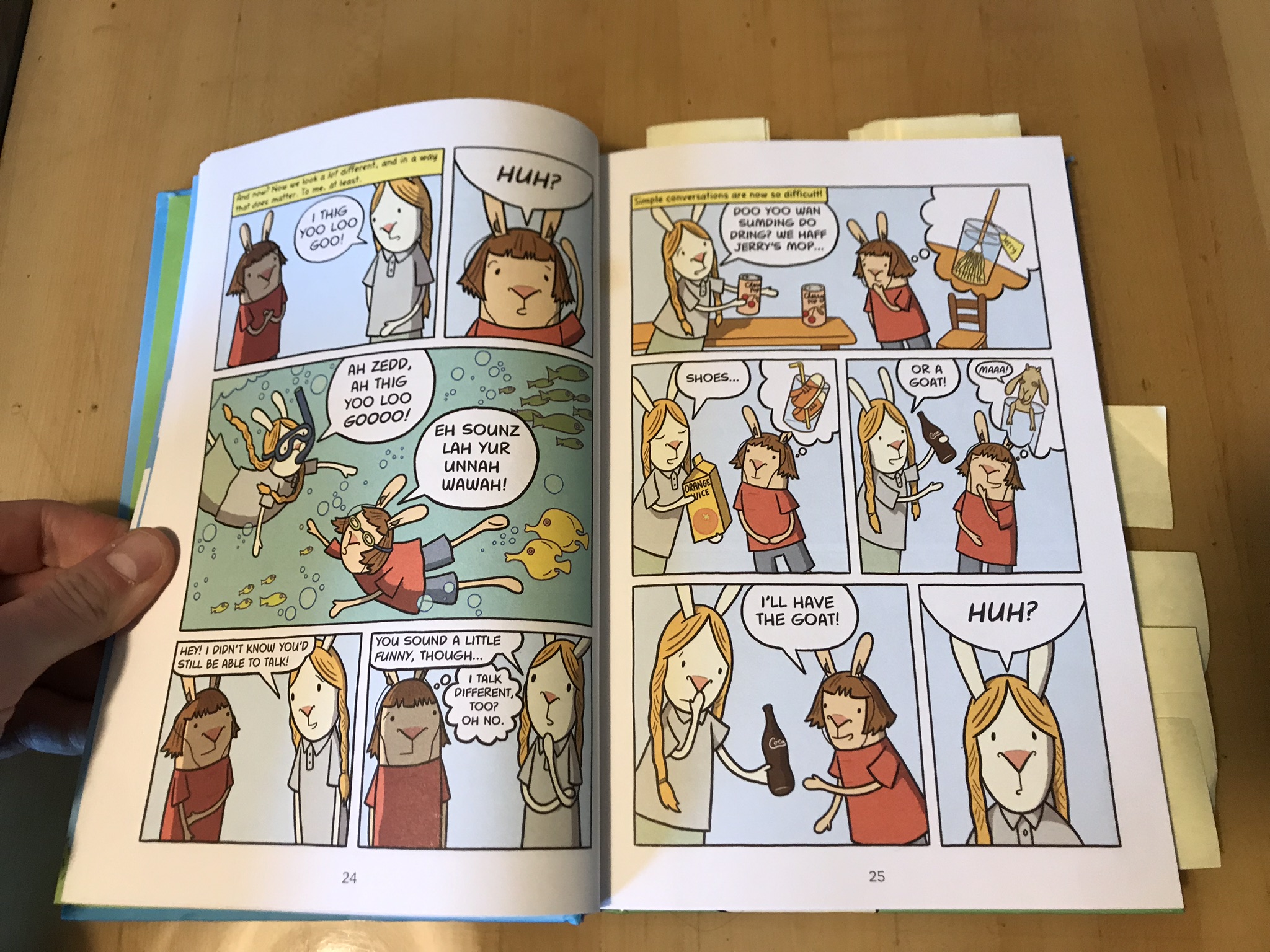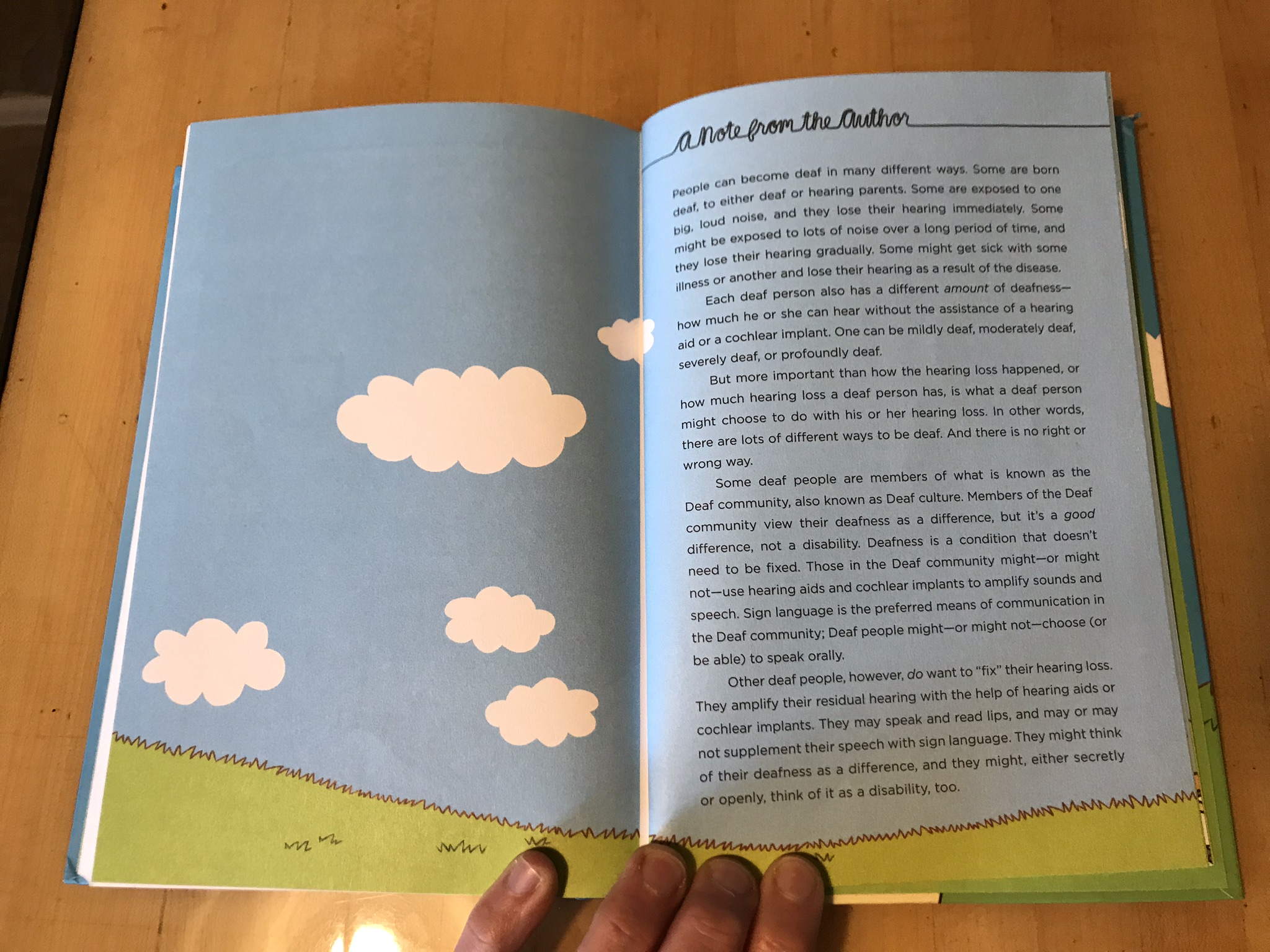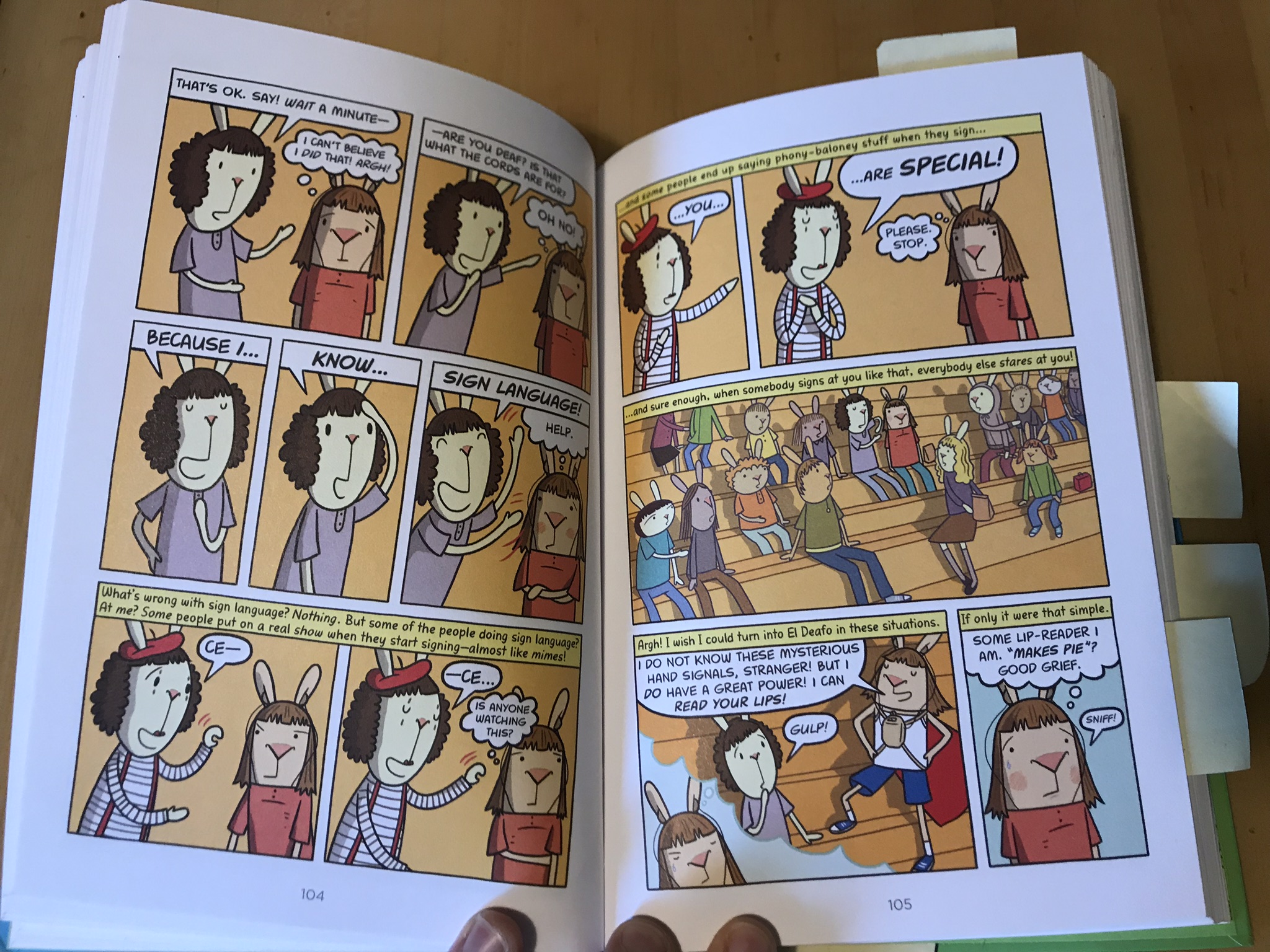Summary of the book: El Deafo is a light-hearted graphic novel that chronicles Bell’s transition into being a Deaf person. She wasn’t born hard of hearing, but rather lost her hearing due to a case of meningitis she had when she was four years old. The book starts with her hearing loss (just before starting Kindergarten), and then follows her all the way to 5th grade, showing us all the ups and downs along the way; her struggles to make friends, what it’s like to lug around her giant hearing aid (and what it’s like to break it!), adventures in forced sign language learning, and even her first elementary school crush.