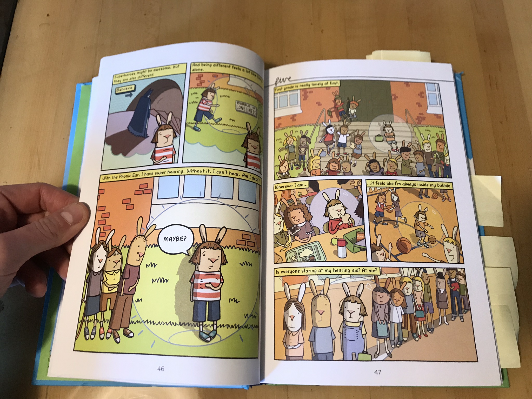 We see Bell struggle to accept sign language classes but later see her reflect on this by being able to see her thought process, “I could have learned how to do that if I had ‘participated.’ And maybe I should have… but then other people would stare at me the way I’m staring at that couple. Right? Oh, why do I even care what other people think?” (2014, pg. 117). We see Bell’s self-consciousness at her hearing aids, her struggles to fit in, worries that everyone is only looking at her hearing aids, and then we see her begin to see herself as a superhero.