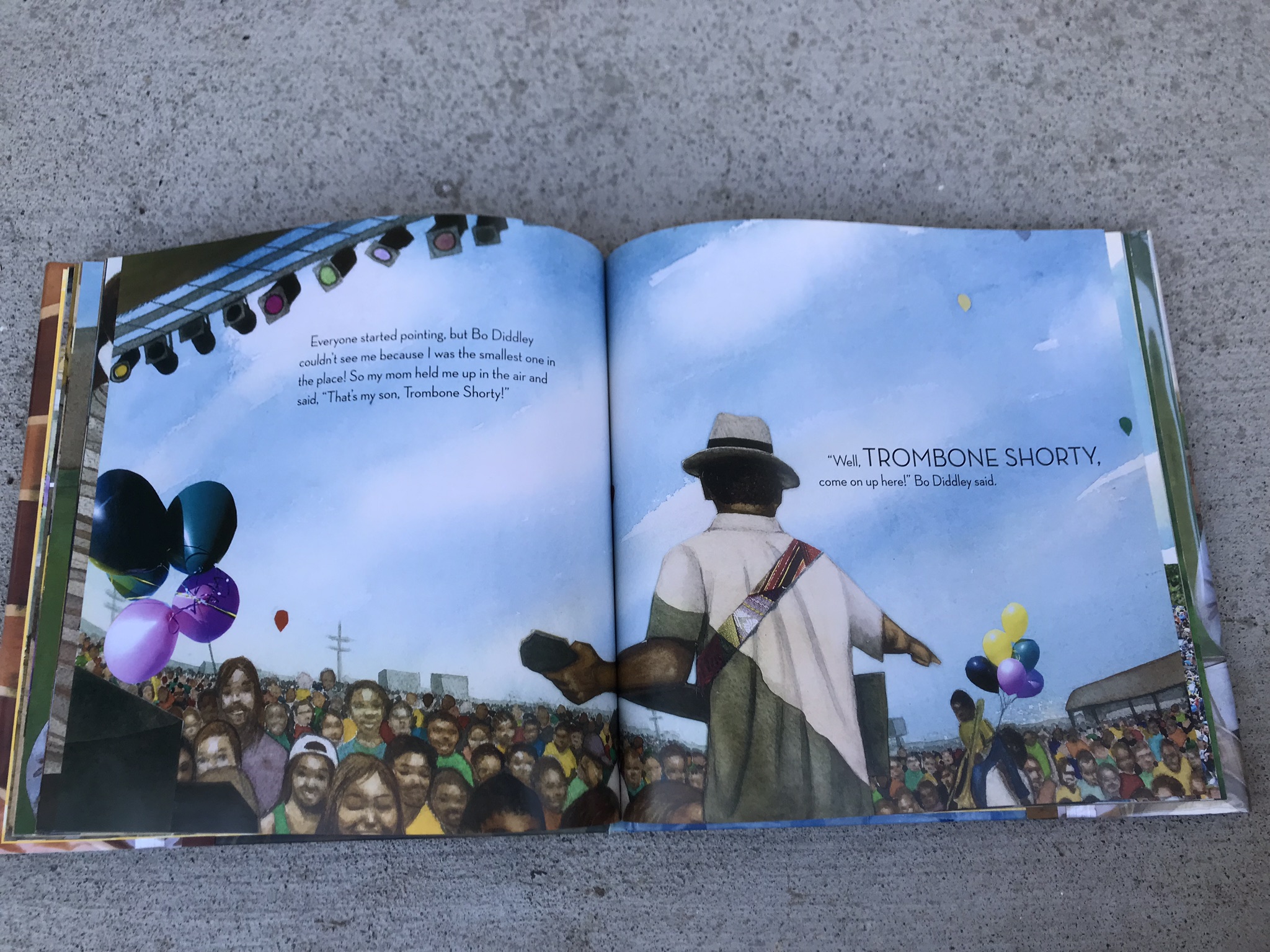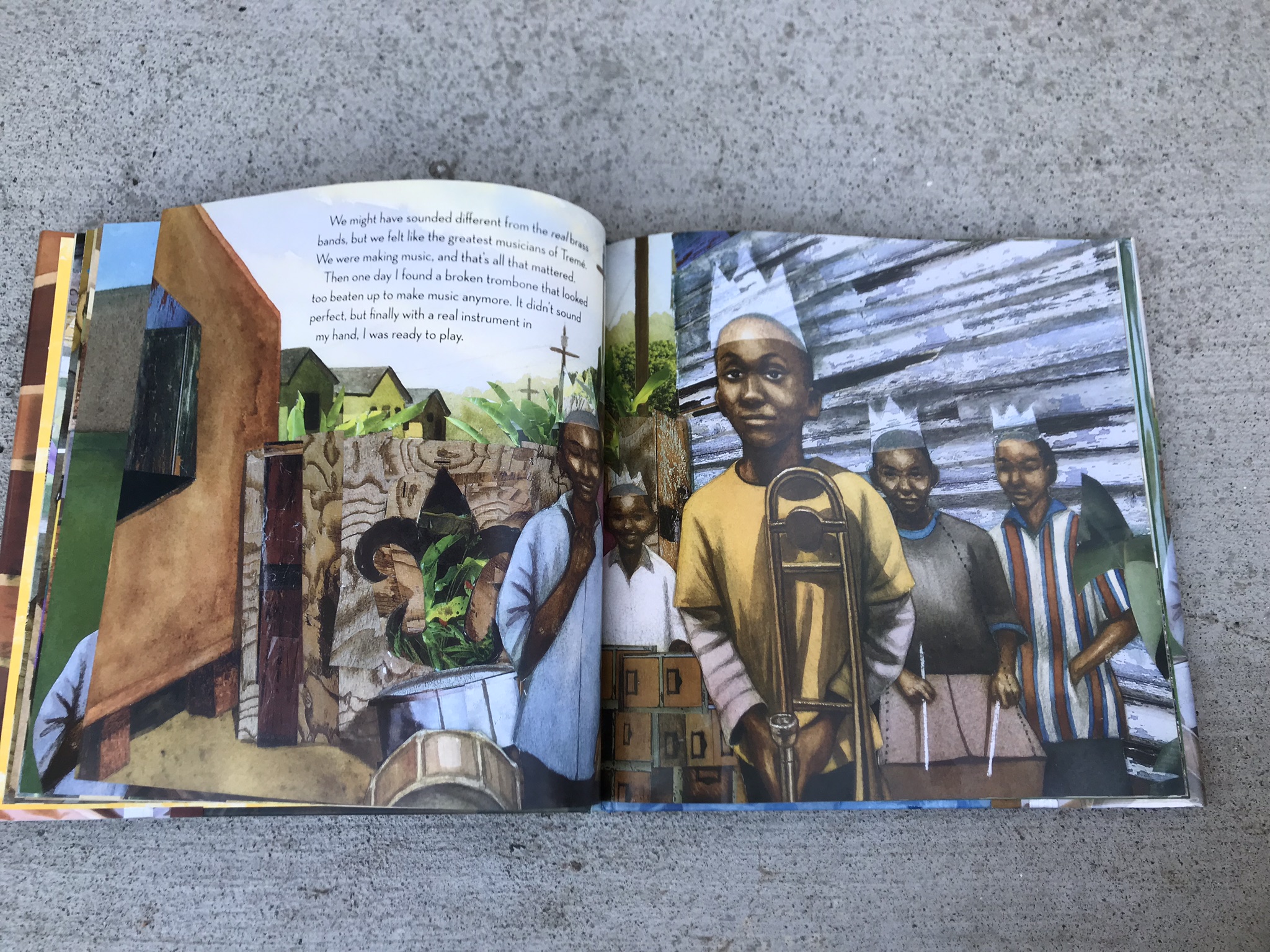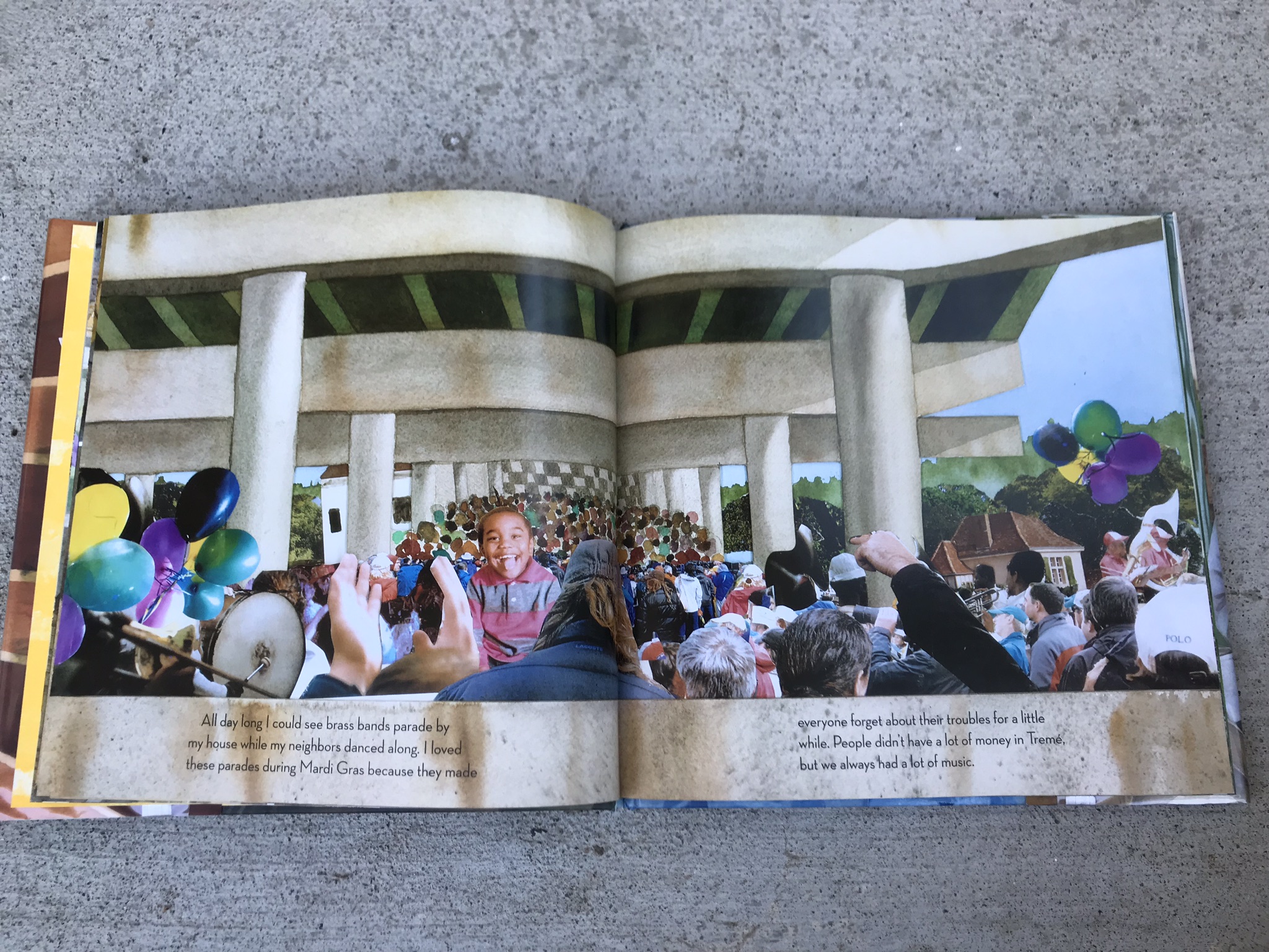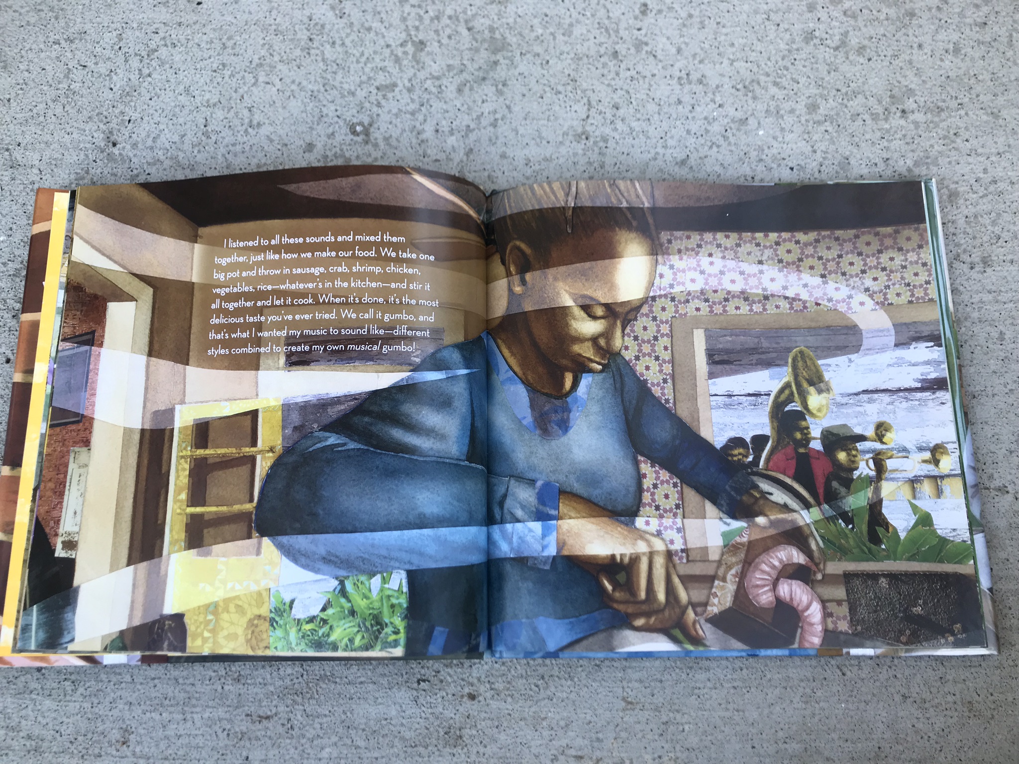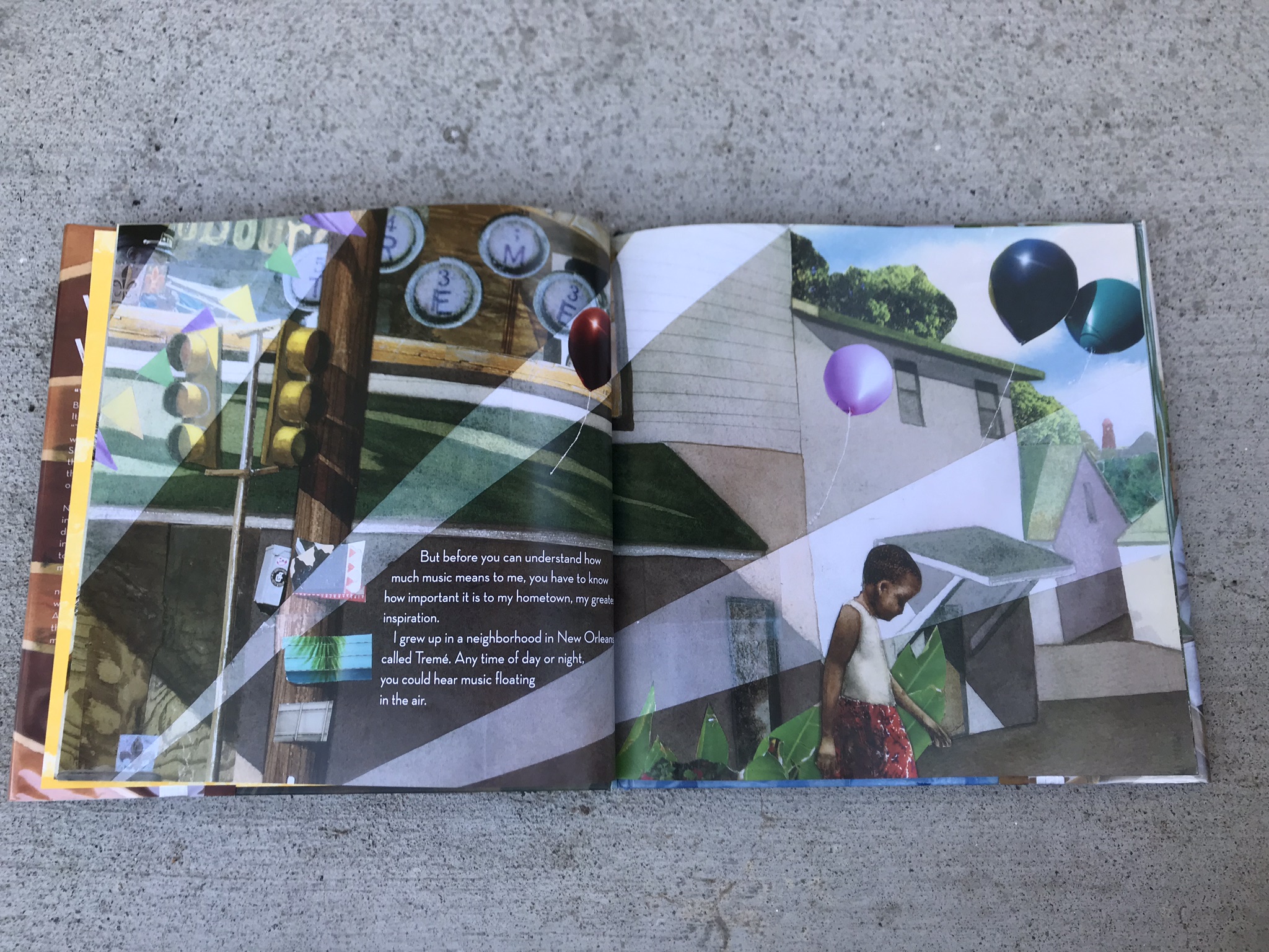 Visual elements in Trombone Shorty: The unique illustrations in Trombone Shorty mirror the uniqueness that is New Orleans. Illustrator Bryan Collier’s mix of collage and watercolor establishes the setting in Andrew’s neighborhood of Treme, New Orleans. Andrews states, “Any time of day or night, you could hear music floating in the air,” (2017). Collier illustrates this scene by showing balloons floating through the air, representing the music being played all through the neighborhood.
