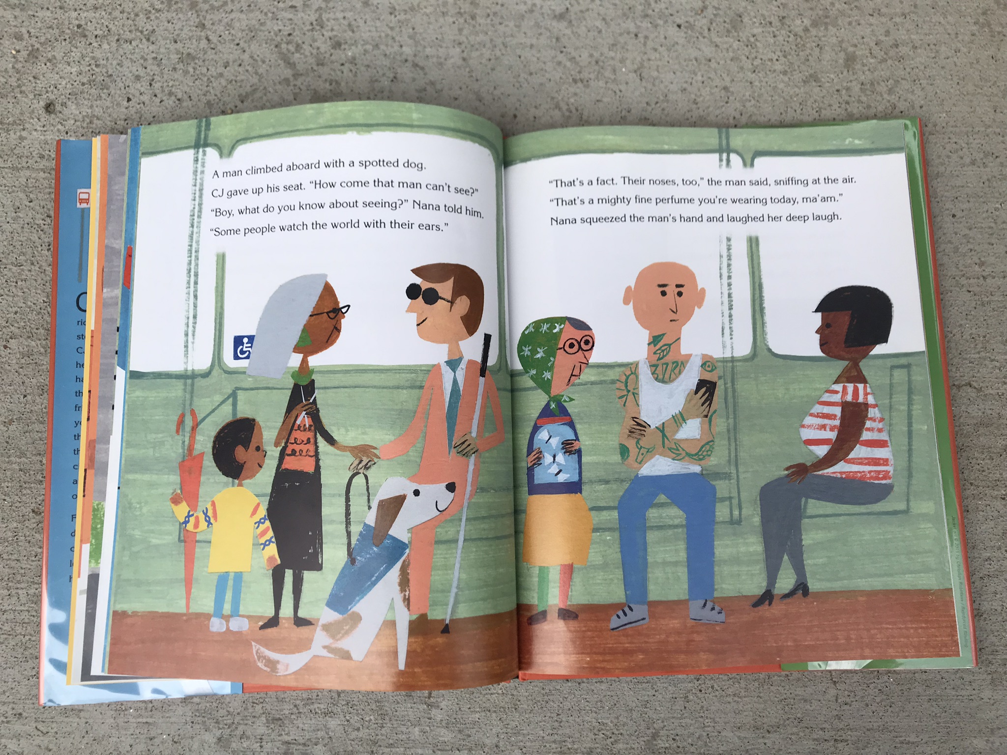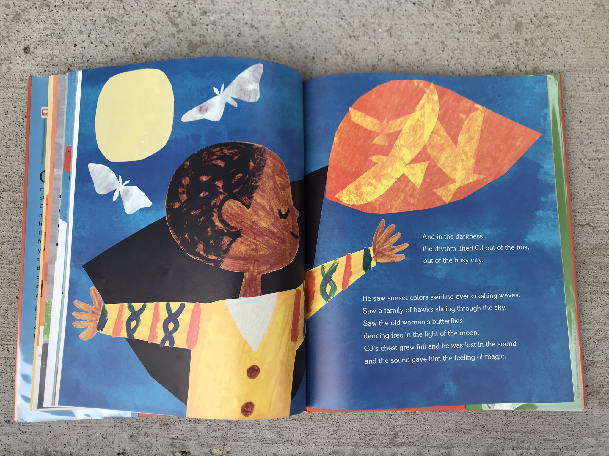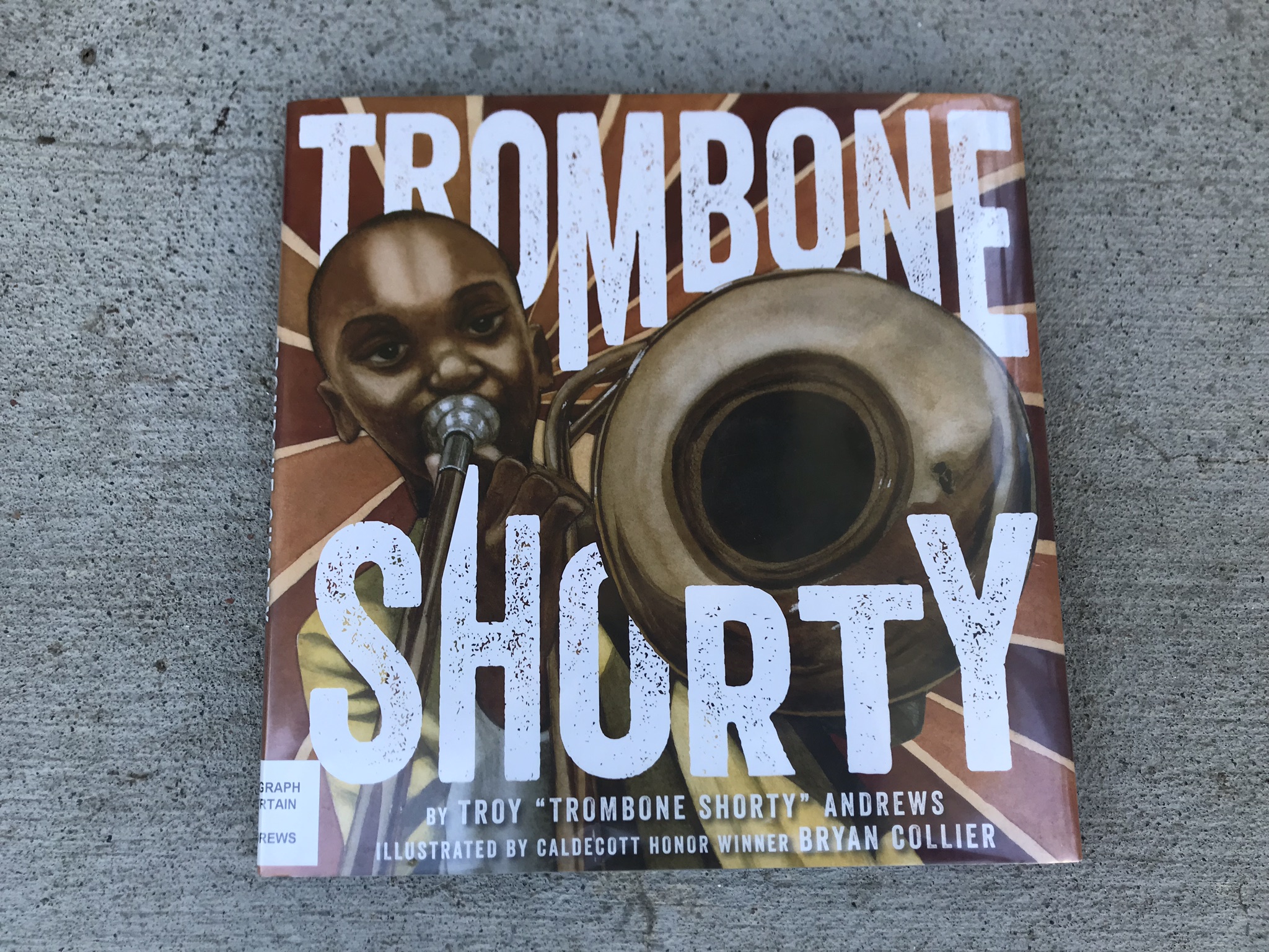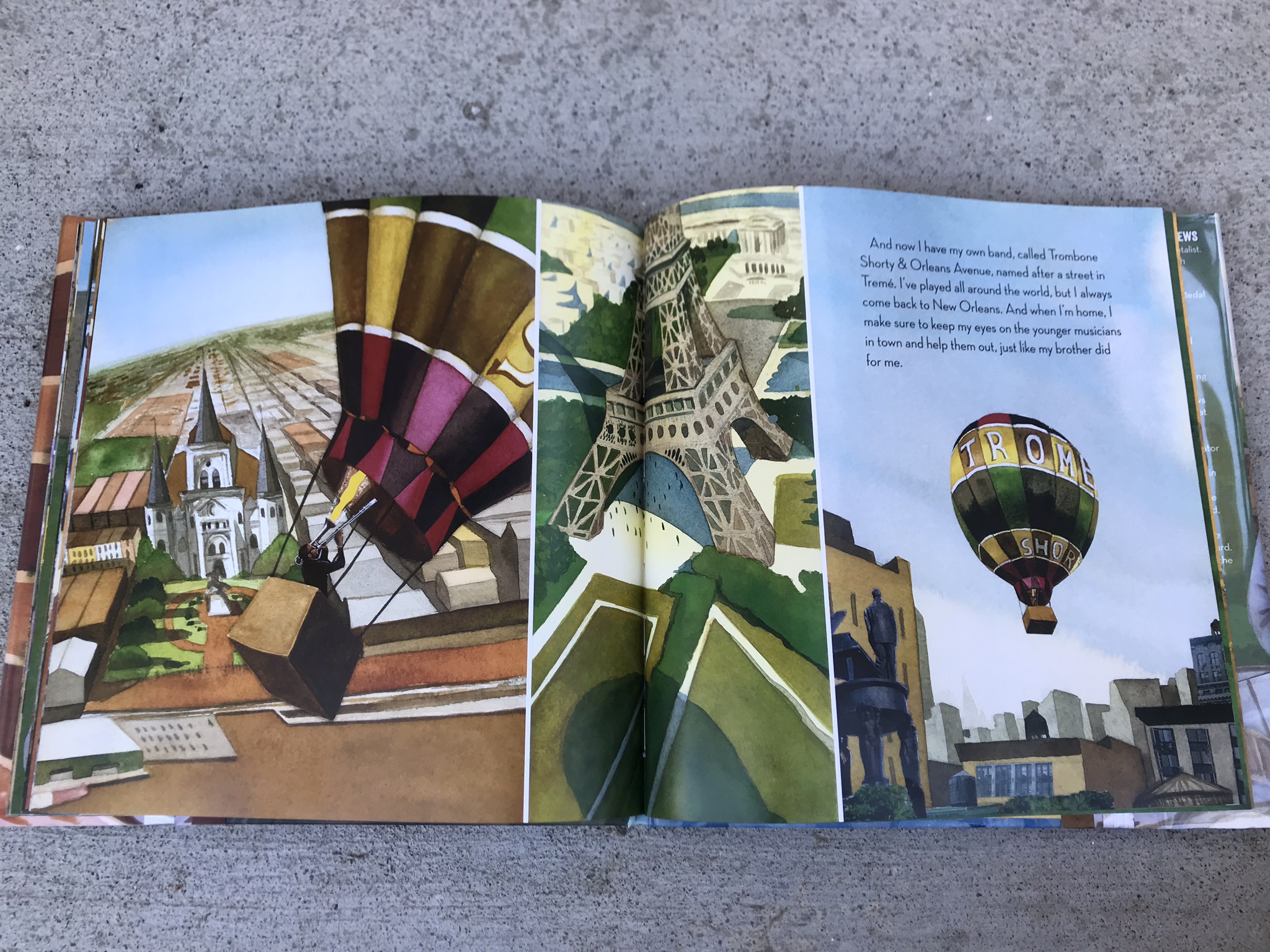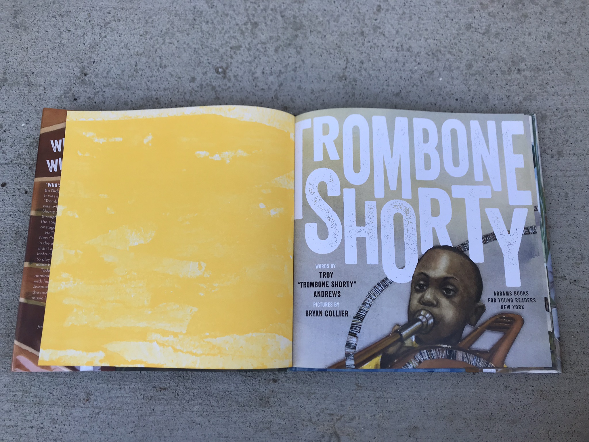 Visual elements in Trombone Shorty: The unique illustrations in Trombone Shorty mirror the uniqueness that is New Orleans. Illustrator Bryan Collier’s mix of collage and watercolor establishes the setting in Andrew’s neighborhood of Treme, New Orleans. Andrews states, “Any time of day or night, you could hear music floating in the air,” (2017). Collier illustrates this scene by showing balloons floating through the air, representing the music being played all through the neighborhood.