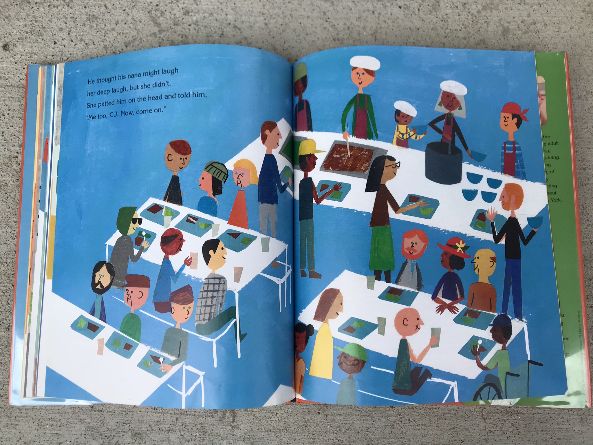 He does this again in a scene with Andrew’s mother cooking in the kitchen, using line to create swirls around the page to represent the heavenly smell of gumbo floating and swirling around in the air.